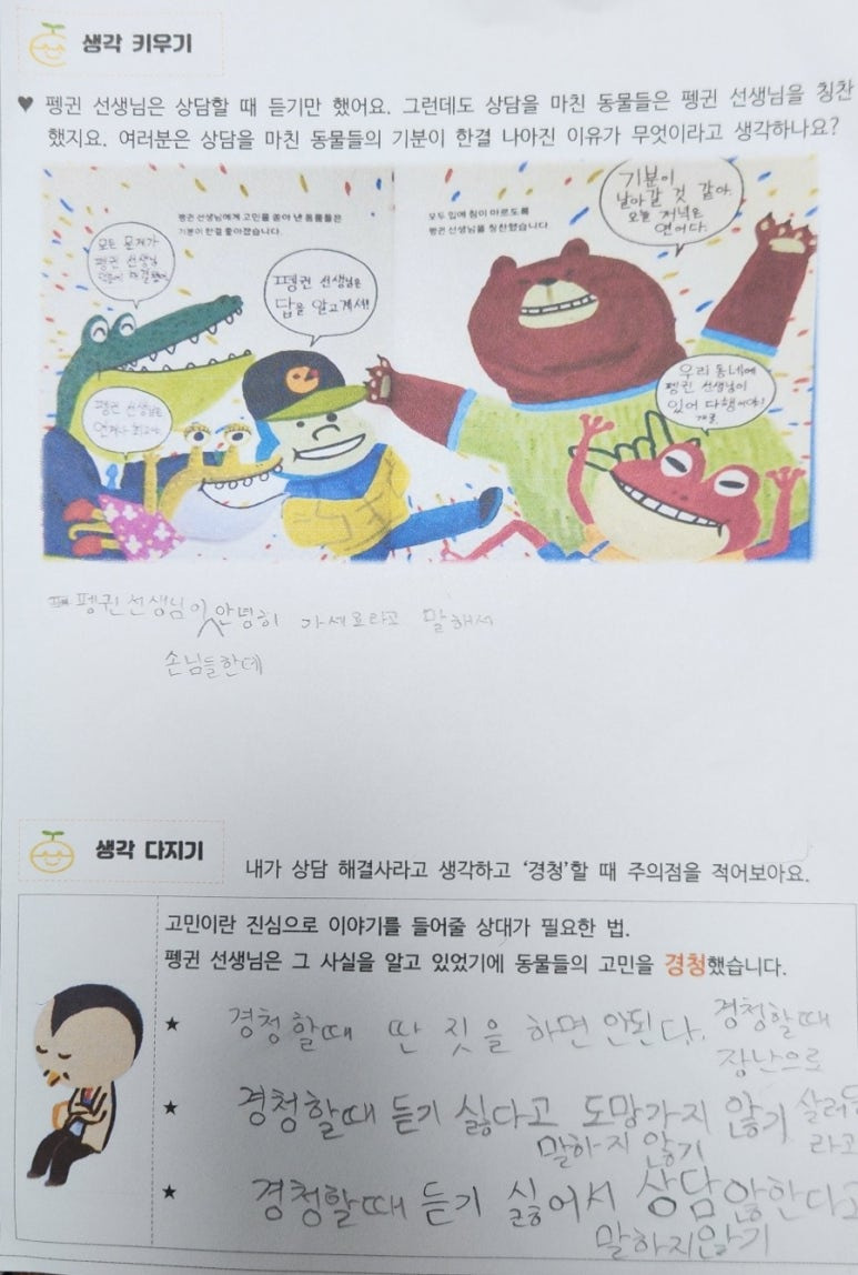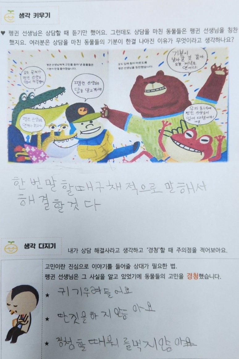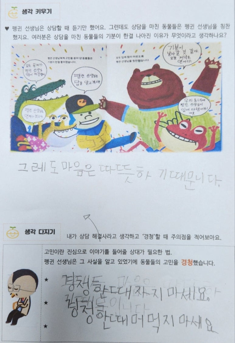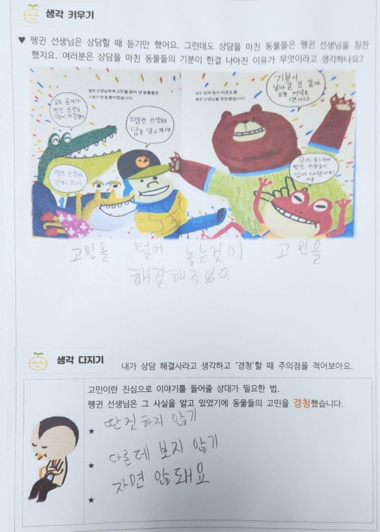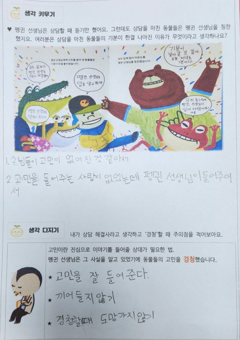 -펭귄 선생님이 상담할 때 아무 말도 안 했는데도 동물들이 마음 편하게 말하게 해줘서 그런 거 같아요.