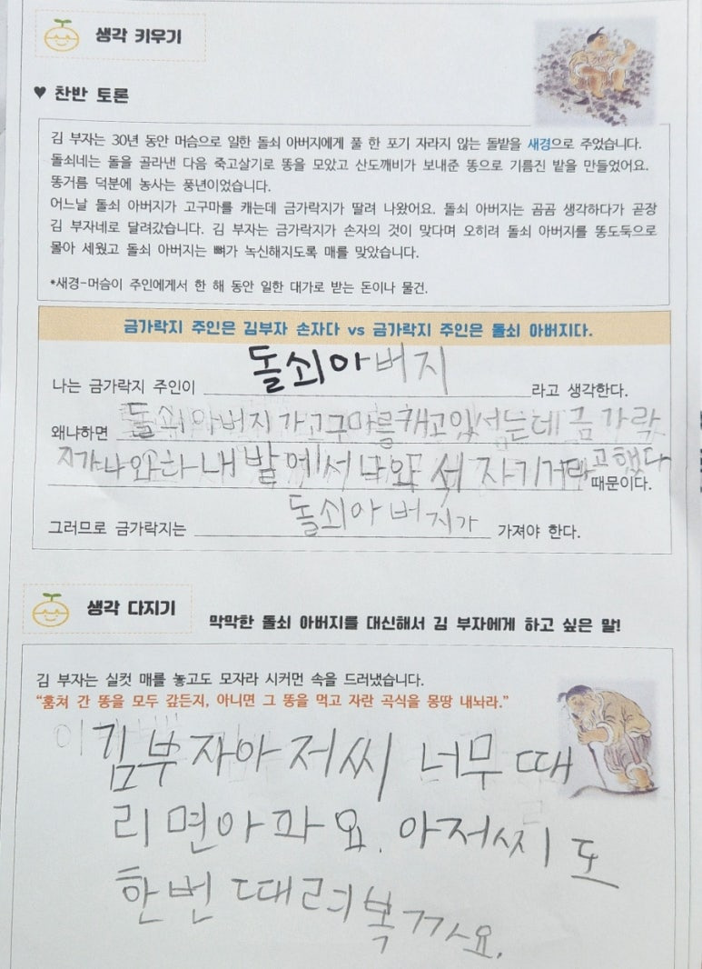 -뼈가 녹신 녹신해지도록 매를 맞은 돌쇠 아버지가 불쌍했어요.