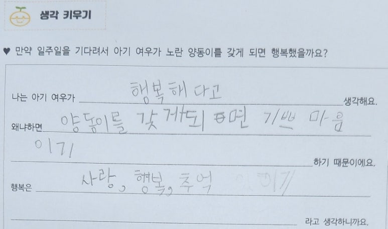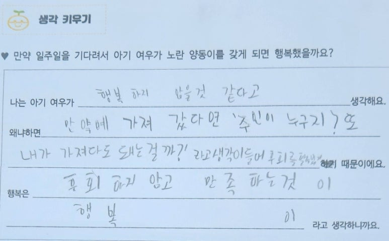 -저는 노란 양동이가 누구의 것인지도 모르고 누군가가 계속 찾고 있을지도 모르니까 아기 여우가 가져가서는 안 될 거 같아요.