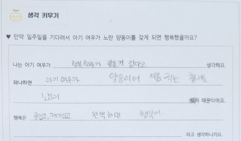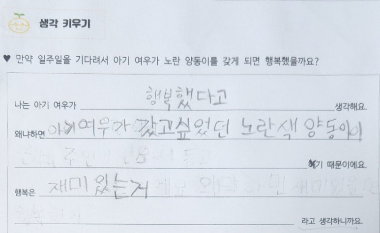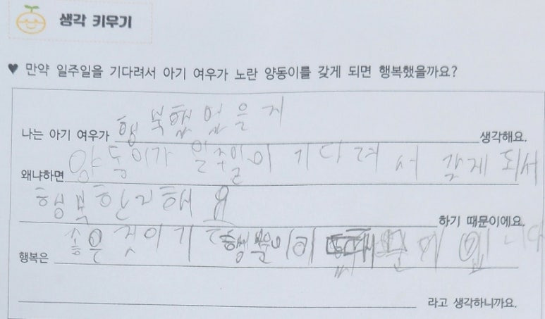 '만약 일주일을 기다려서 아기 여우가 노란 양동이를 갖게 되면 행복했을까요?'