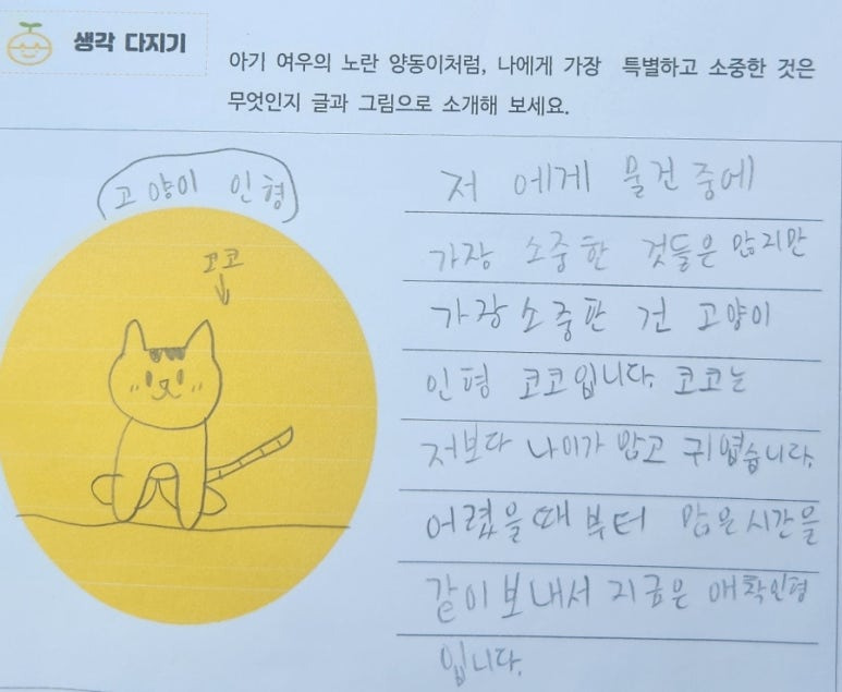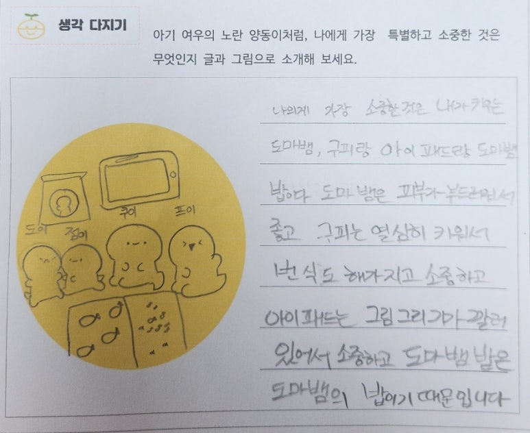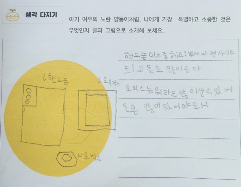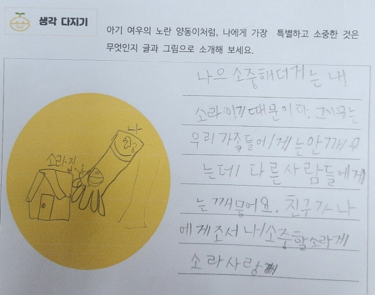 아기 여우의 노란 양동이처럼, 나에게 가장 특별하고 소중한 것은 무엇인지 글과 그림으로 소개해 보세요.