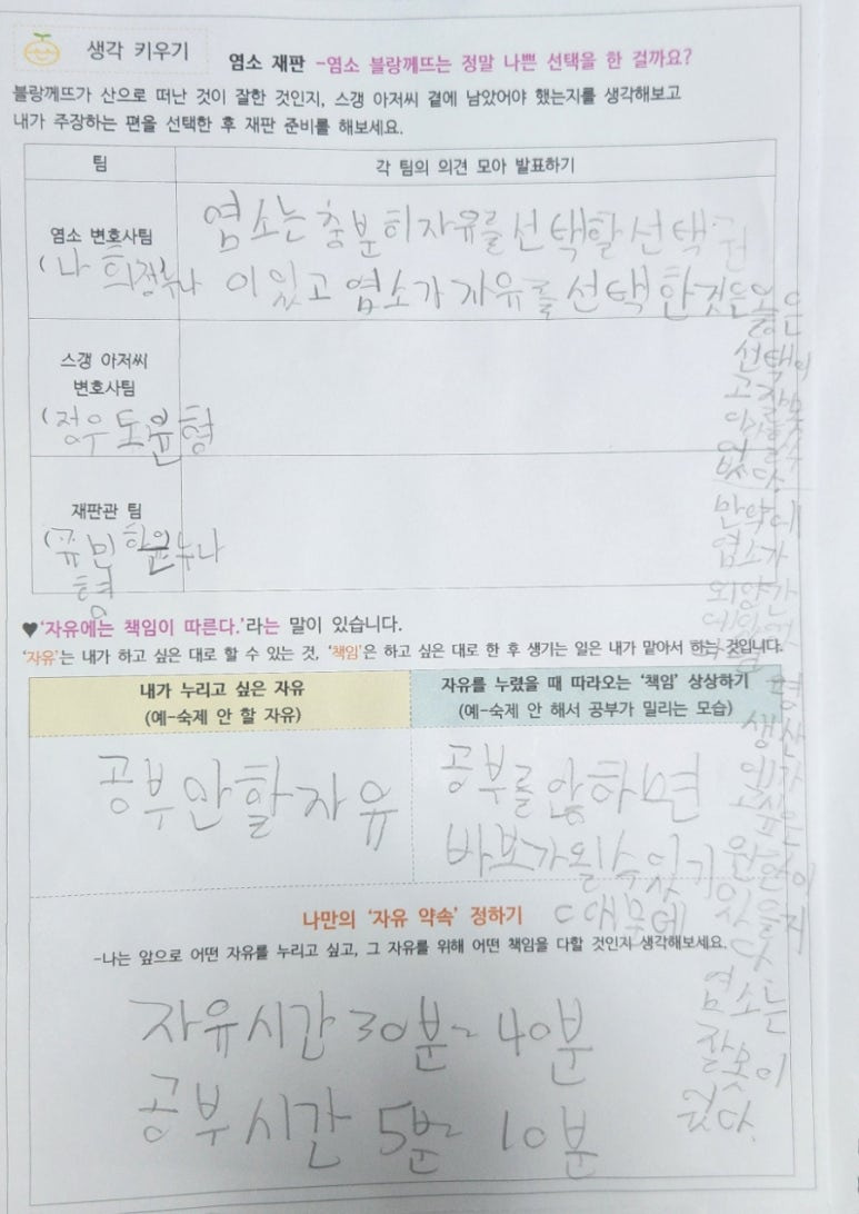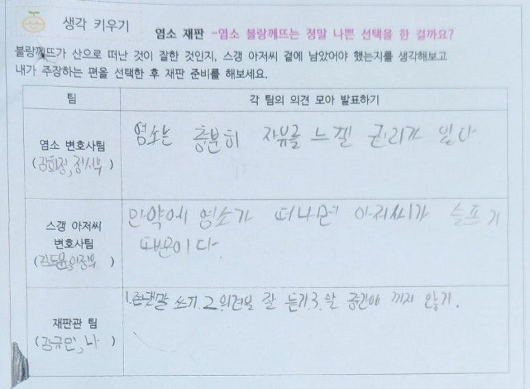 판결을 내리도록 하겠습니다. 우리는 염소 변호사 팀의 발언이 더 적절하다고 판단했습니다. 여러분이 염소와 입장을 바꾸어 한 번 더 생각해 보시기 바랍니다. 예를 들어, 어머니가 나를 너무 아껴서 바깥으로는 절대 나가지 말라. 아무 대도 가지 말라'라고 한다면 여러분은 얼마나 답답하시겠습니까. 그렇게 생각해 보면 염소도 같은 심정으로 힘들었을 것이라고 생각합니다.