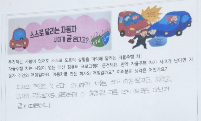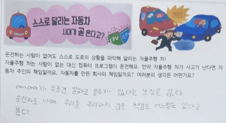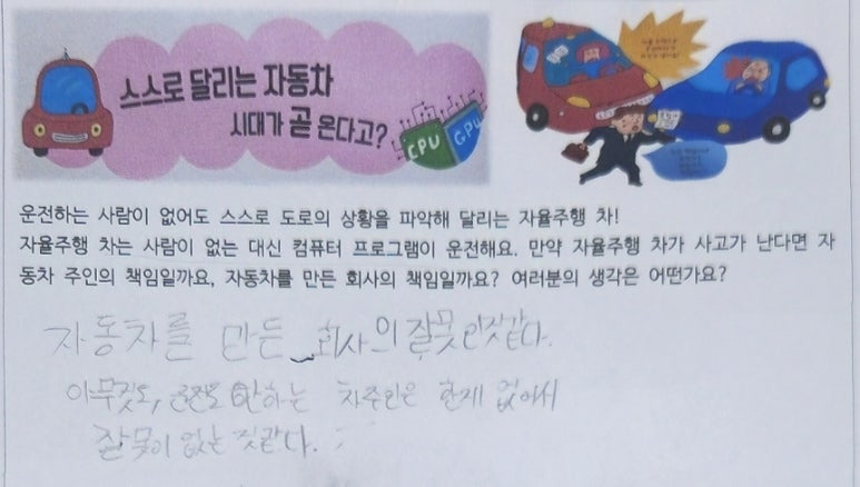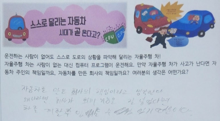 -아무리 인공지능이 뛰어나다고 해도 오류는 언제나 생길 수 있는 문제인데 이것을 가지고 자동차 회사에 책임을 지우는 건 아닌 거 같아요. 차 주인은 자율주행차가 운전을 대신해 준다고 해도 앞을 제대로 본다거나 운전에 조금이라도 신경을 써야 한다고 생각해요. 그래서 자율주행차 사고는 차 주인의 책임도 있어요.