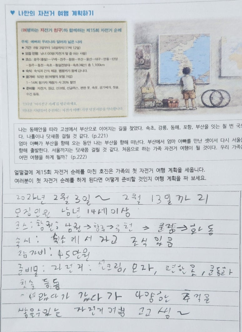 -만약에 제가 자전거를 잘 탈 수 있다면 호진이처럼 자전거 여행을 해보고 싶다는 생각이 들었어요.
