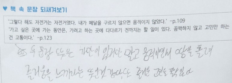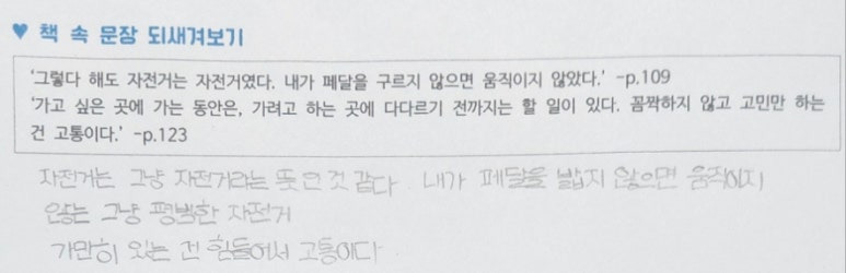 -처음부터 부모님의 이혼 이야기가 나오고 심각한 상황이었는데 갑자기 자전거 여행이 나오면서 분위기가 전환돠어서 또 흥미롭게 읽었어요.