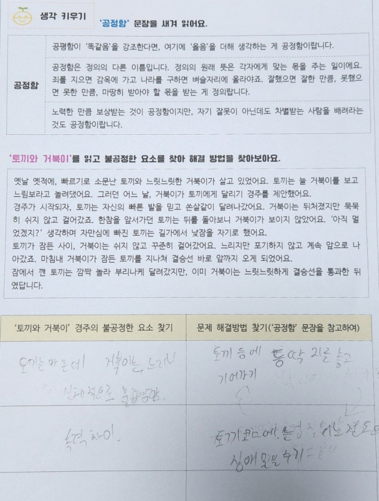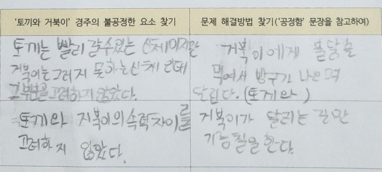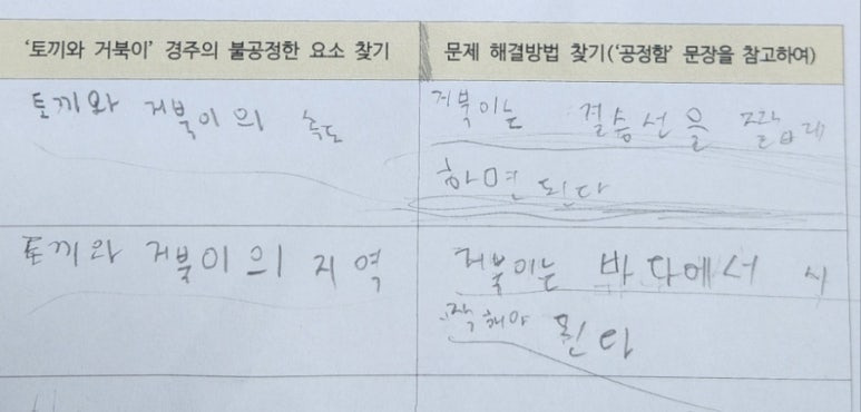 '토끼와 거북이'를 읽고 불공정한 요소를 찾아 해결 방법을 찾아보아요.