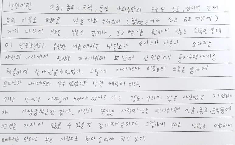 이 책을 통해 나는 난민에 대해 더 잘 알게 되었고 난민도 우리와 똑같은 사람이라는 걸 다시 한번 더 느꼈다. 그리고 탈북민은 당연히 북한을 떠난 거니까 난민이라고 생각했는데 대한민국 국민으로 여긴다는 게 놀라웠다.