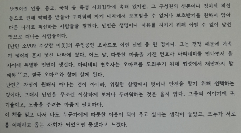 나는 난민이 집과 부모를 잃은 사람이라고 생각했는데 이 책을 통해 난민에 대해 좀 더 자세히 알게 되었다. 우리나라도 일제 강점기와 6.25 때 난민이 된 적이 있으니까 난민에 대해 이상한 편견을 갖지 말고 그 사람들이 왜 난민이 되었는지 알아보고 도울 수 있는 방법을 생각해 보아야겠다.