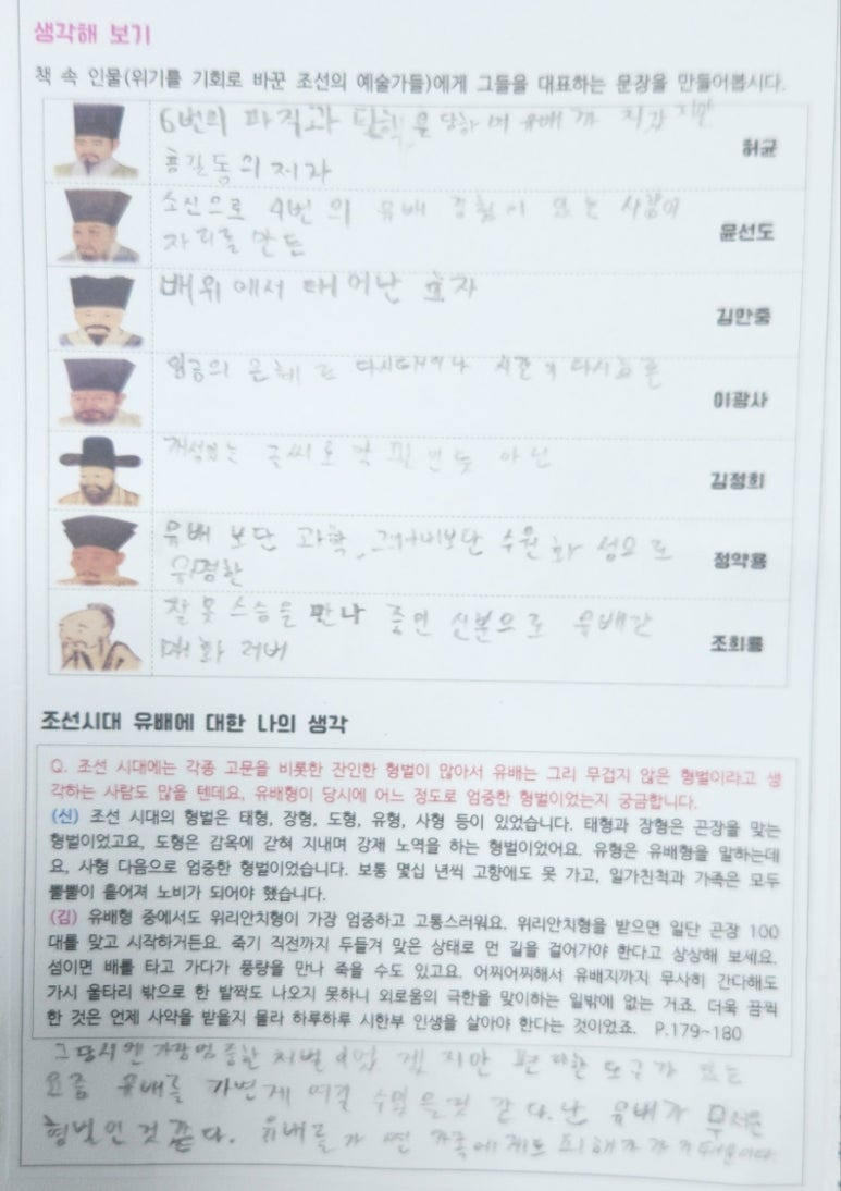 -평소에는 나라 일을 하느라 너무 바빴을 텐데 유배지에서는 시간이 너무 많기도 하고 책을 쓰거나 자신이 좋아하는 일을 하는 것으로 힘겨움을 해소할 수 있어서 이런 상황이 더 많은 업적을 남기게 하긴 했을 거 같아요.