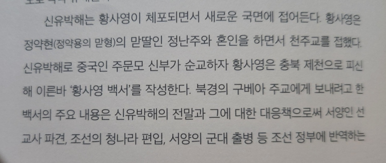 황사영은 정약용의 큰 형인 정약현의 사위입니다. 그러면 황사영은 정약용에게는 조카사위가 됩니다. p.147에는 정약용과 정약전이 황사영의 조카사위라고 되어 있는 것을 알았습니다. 옥에 티가 있어서 아쉽습니다.