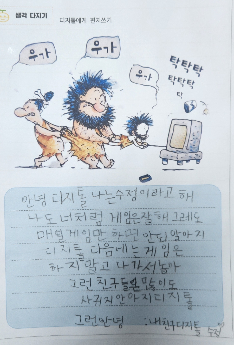 -나도 게임을 좋아하지만 디지톨처럼 방에 콕! 박혀 있지는 않고 놀이터에서도 자주 놀고 친구들이랑도 잘 놀아요.
