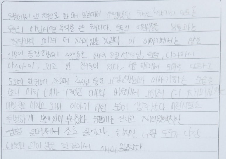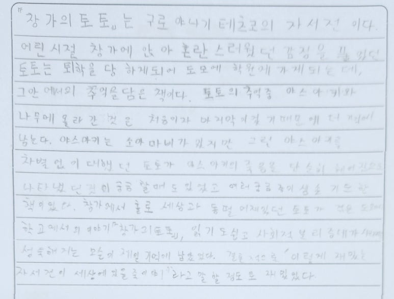 -교장 선생님이 다카하시를 위한 프로그램이라고 대놓고? 말하지 않았다면 괜찮을 거 같아요. 이 말을 했다면 다른 아이들의 불만이 있었을 거 같거든요. 토토가 이 책을 쓰는 동안 운동회를 떠올려 보았을 때 교장 선생님의 의도가 이랬을 것이다고 생각한 거니까 오히려 교장 선생님의 깊은 의도를 알아챈 거니까요.