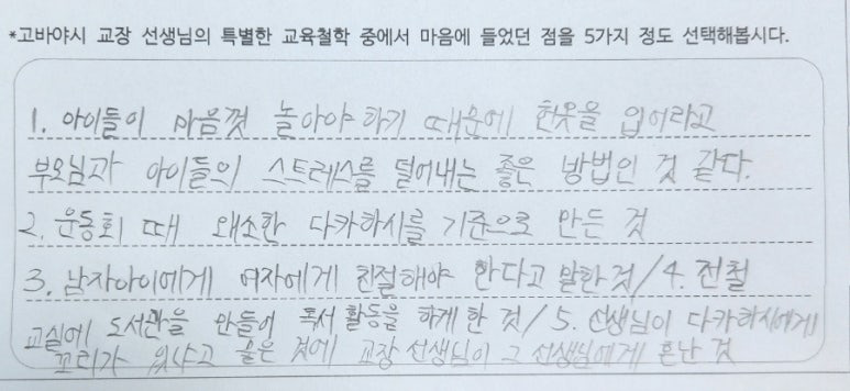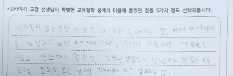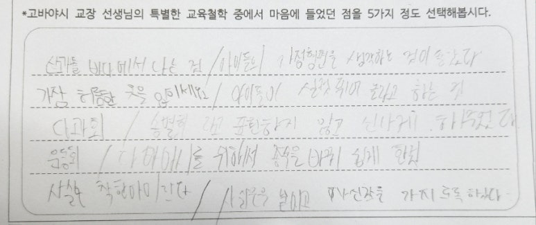 -고바야시 교장 선생님의 특별한 교육철학 중에서 마음에 들었던 점을 5가지 정도 선택해 봅시다.