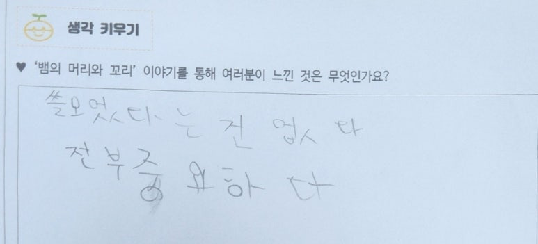 -뱀이 머리로 가지 않고 꼬리로 가니까 특별하고 신기한 뱀이라고 생각할 거 같아요.